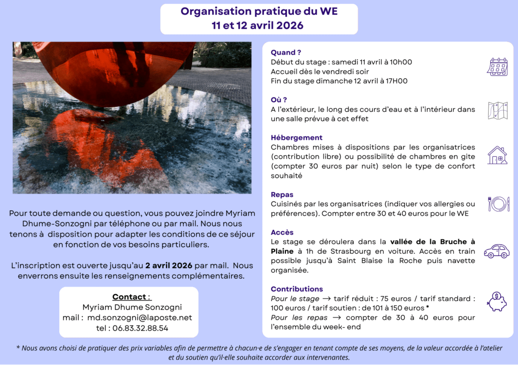 Ce cycle d’écriture est une invitation à déployer nos mots dans l’espace avec fluidité, liberté et confiance. C’est un voyage au fil de l’eau, celle qui nous entoure mais aussi celle qui nourrit nos cellules et nous constitue.